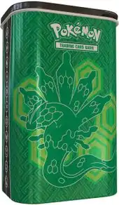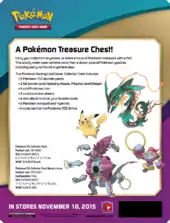 Shortly after the BREAKthrough expansion, the BREAKthrough Collector Chest was released on November 18, 2015. Much like the first Collector Chest released one year prior, the BREAKthrough Collector Chest features a metal clasp and plastic carrying handle, and is emblazoned with a design that covers the circumference of the tin. This design features Mega Rayquaza and Hoopa Unbound. Each chest contains 5 booster packs, 3 promotional cards featuring Hoopa, Pikachu, and Chespin, a coin, 2 sticker sheets including Legendary Pokémon, a mini album to store cards, a Pokémon notepad, 4 pencils with a unique Pokémon design, and a bonus code card for the Pokémon TCG Online.