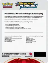 The Launch Display for the BREAKthrough expansion also became available starting November 4, 2015. Each display contains 4 of each Theme Deck—Burning Spark and Night Striker—as well as 72 booster packs from the expansion, and 8 each of the two promotional cards included in the BREAKthrough Three Pack Blisters: Sableye and Celebi.