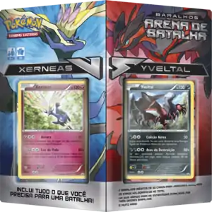 April 2015 brought with it a new type of product, named the Baralhos Arena de Batalha: Xerneas vs. Yveltal (English: Battle Arena Decks: Xerneas vs. Yveltal). This pair of decks, released on April 8, 2015, were themed around the mortality duo as two 60-card Theme Decks that each contained a never before seen promotional card of their respectively featured Pokémon, Xerneas or Yveltal. Together the decks contain 20 Sheen Holofoil cards. The product also comes with 2 metallic coins, a 2-player playmat and rulesheet, a code card to play these decks on the Pokémon Trading Card Game Online, two deckboxes, two sets of damage counters, and a Quick Guide to help players bolster their strategies.