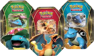 On March 23, 2015, a new trio of Pokémon-EX Tins was brought to the Pokémon Trading Card Game, this time named the Latas Power Trio EX (English: EX Power Trio Tins). This group of tins featured the Kanto starter Pokémon Venusaur, Charizard, and Blastoise as a reprinted Pokémon-EX originally released in the XY or Flash de Fogo expansions. Each print features new artwork done by the original artist, Eske Yoshinob, and is an alternate artwork to the prints of the cards originating from Collection X (Venusaur-EX), Collection Y (Blastoise-EX), and Wild Blaze (Charizard-EX) in Japan. Each tin contained four booster packs.
