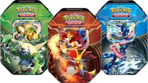 The Latas Hoenn Power (English: Hoenn Power Tins), featuring three different Pokémon-EX, were made available starting December 11, 2015. Containing four booster packs and a code card for the TCGO, the three tins feature Sceptile, Blaziken, and Swampert, the three final starter evolutions of the Hoenn region, as Pokémon-EX cards. Like the last released Latas Lendas de Hoenn, the code card unlocks a full 60-card deck (the code from the Sceptile-EX tin unlocks the Sceptile-EX Deck, the code from the Blaziken-EX tin unlocks the Blaziken-EX Deck, and the code from the Swampert-EX tin unlocks the Swampert-EX Deck).