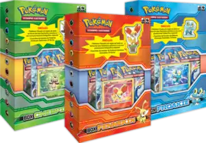 A trio of Boxes XY com os Pokémon Iniciais de Kalos (English: Kalos Starter Figure Boxes) made their debut on May 28, 2014. Each box contained a commemorative figure and a Sheen Holofoil promotional card featuring their respective Pokémon and three Black & White Series booster packs.