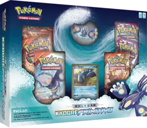 Released on August 20, 2015, the Coleção Kyogre Primitivo (English: Primal Kyogre Collection) contains a figure of Primal Kyogre. The box features the Sea Basin Pokémon as one of the XY Black Star Promos and six booster packs from recent expansions.