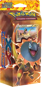The next installment of Theme Decks were for the Flash de Fogo (English: Flashfire) expansion. These two Theme Decks, featuring the Generator Pokémon Heliolisk and the Constraint Pokémon Meowstic, were released alongside the main expansion September 12, 2014. The Trovão Reluzente Heliolisk Theme Deck featured Fire-type and Lightning-type Pokémon, while the Tufão Místico Meowstic Theme Deck featured Water-type and Psychic-type Pokémon. As with other Theme Decks, these also included exclusive Cracked Ice Holofoil prints of their featured Pokémon, in addition to damage counters, a custom coin, a rule sheet, a deckbox featuring their respective Pokémon, and a code for the Pokémon Trading Card Game Online, allowing players to unlock the deck online.