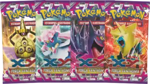 The fourth expansion of the XY Series, Força Fantasma (English: Phantom Forces), released with two new Theme Decks for the Pokémon Trading Card Game. Available starting February 20, 2015, the Talonflame Theme Deck Ventos Ardentes and the Galvantula Theme Deck Tornado de Raios feature these two Pokémon, the Fire-type and Lightning-type respectively, as well as the Grass-type and Psychic-types respectively. Each deck includes an exclusive Cracked Ice Holofoil print of their featured Pokémon, in addition to damage counters, a custom coin featuring Mega Gengar, a rule sheet, a deckbox featuring their respective Pokémon, and a code for the Pokémon Trading Card Game Online, allowing players to unlock the deck online.