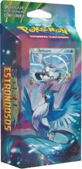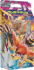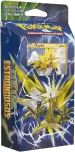 As the sixth XY Series expansion, Céus Estrondosos (English: Roaring Skies) continues to release a pair of Theme Decks, with this pair being themed around two of the three Legendary birds: Zapdos and Articuno. The decks were available with the expansion starting August 14, 2015. The Lightning-type and Grass-type are featured in the Cavaleiro da Tempestade Theme Deck and the Water-type and Fire-type are featured in the Explosão da Aurora Theme Deck. Each Theme Deck also contained the typical damage counters, coin featuring Mega Rayquaza, playmat, deckbox, and code card for the TCGO.