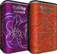 The Latas Porta-Cards Treinador de Elite (English: Primal Clash Elite Trainer Deck Shields) were released August 17, 2015, three days after the release of Céus Estrondosos. The tins come in two designs, one featuring Kyogre and Groudon, and the other featuring Mega Gengar and Mega Lucario. Each metal tin has room for carrying around a deck plus a storage compartment in the lid to hold dice and damage counters. The product also was packaged with 2 booster packs.