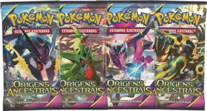 The Origens Ancestrais Booster packs were released along with the Theme Decks on October 30, 2015, featuring Shiny Mega Rayquaza, Mega Tyranitar, Hoopa, and Shiny Primal Groudon. They were also available inside blisters.