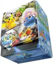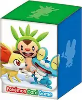 Deck case: The Chespin, Fennekin & Froakie Deck Case (Japanese: デッキケース ハリマロン・フォッコ・ケロマツ Deck Case: Harimaron•Fokko•Keromatsu) has capacity to store 180 cards and comes with 2 dividers featuring the same artwork as the case itself—one is white and the other has red, green, and blue stripes matching the color scheme of the case sides and top.