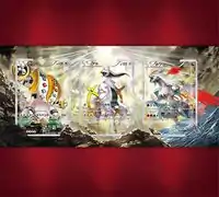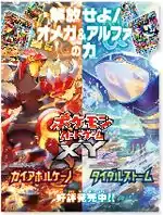 Another special pack available from July 18, 2015 was the Hoopa's Appearance~! Album Set (Japanese: 映画公開記念<劇場・ポケモンセンター限定> 「フーパのおでまし~!アルバムセット」 Movie Commemoration <Theater•Pokémon Center Limited> Hoopa's Appearance~! Album Set), which comes with two Legendary Shine Collection Concept Packs, released on the same day, and an album for displaying up to 12 cards. Two pages in the album feature large illustrations that can be completed by inserting the appropriate cards. The first page contains an illustration by Naoki Saito, which features an arid landscape and Dahara City in the distance, and includes space for the promotional Hoopa card available to movie patrons. The second page contains a landscape illustration by Shin Nagasawa and includes spaces for Regigigas, Arceus, and White Kyurem, all from the Legendary Shine Collection. Although the last two pages contain no large illustration, the display flaps on the third page have the edges of Reshiram and Black Kyurem, which form a collective image by Mitsuhiro Arita.