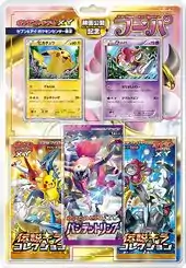 An array of merchandise was released in conjunction with the Japanese opening of Hoopa and the Clash of Ages in cinemas. Available from July 18, 2015 was the Hoopa Movie Commemoration Special Pack (Japanese: 映画公開記念スペシャルパック フーパ<セブン&アイ・ポケモンセンター限定> Movie Commemoration Special Pack: Hoopa <Seven & I•Pokémon Center Limited>), sold exclusively in Pokémon Centers and stores owned by Seven & I Holdings Co.. It includes two original Sheen Holofoil promotional cards featuring a Pikachu and a Hoopa, plus two Legendary Shine Collection Concept Packs and one Bandit Ring booster pack.