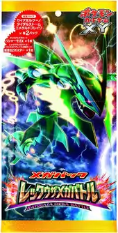 Continuing with trends established the previous year, the campaign leading up to the start of the Rayquaza Mega Battle in May 2015 saw the release of another large booster pack-style item of merchandise. Released on April 17, 2015 was the Rayquaza Mega Battle Mega Pack (Japanese: メガパック 「レックウザメガバトル」), which comes packaged with a double-sided B2 poster, six booster packs, and one promotional Blaziken-EX card. The selection of booster packs include two from Gaia Volcano, two from Tidal Storm, and two from Emerald Break; the poster features artwork promoting the Rayquaza Mega Battle on one side and an Emerald Break card gallery on the other.