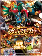 As part of a collective campaign leading up to the beginning of the Lizardon Mega Battle beginning in May 2014, a special commemorative pack was released on April 19, 2014. The Lizardon Mega Battle Mega Pack (Japanese: メガパック 「リザードンメガバトル」) is presented in the same foil packaging as booster packs, though is considerably larger, and contains a double-sided B2 poster, 6 booster packs, and 1 of 3 random promotional cards. The poster features the Flame Pokémon Charizard on one side and a Wild Blaze card gallery on the other. The 6 booster packs comprise 2 from Collection X, 2 from Collection Y, and 2 from Wild Blaze. The 3 promotional cards available include Chespin, Fennekin, and Froakie, all of which had previously featured English-exclusive artwork.
