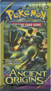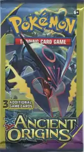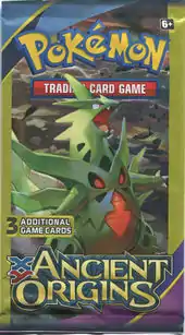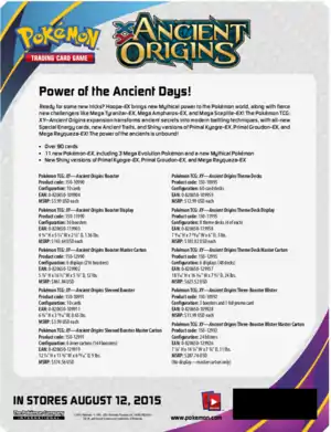 The 3-card Mini Packs for the Ancient Origins expansion, sold exclusively at Dollar Tree stores, were available midway through October 2015. For only one dollar, the packs contained one Common, one Uncommon, and any other one card from the Ancient Origins expansion, along with a promotional advertisement. These promotional advertisement featured the Ancient Origins expansion on one side, with the other side promoting one of four things: Play! Pokémon, Pokémon TV, Pokémon.com, or the Pokémon anime. The packs for this expansion featured a redesigned front, with text shifted around the front of the packaging.