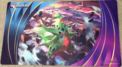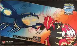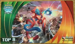 Available at the 2015 Pokémon National Championships, held July 3-6, was a wide array of exclusive merchandise awarded for participating, winning, or staffing. For the Video Game Championships, each entrant was given a special Rayquaza and Deoxys themed playmat, printed with a competitor stamp. This same playmat was available in side events without any stamp printed on it. The artwork is one of the promotional artworks made for the Delta Episode of Pokémon Omega Ruby and Alpha Sapphire.
