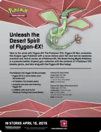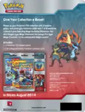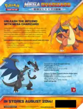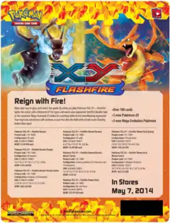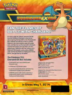 Available the same day as the Flashfire expansion, the Charizard-EX Box was released May 7, 2014. This promotional box, similar to the Garchomp-EX Box contained a promotional Pokémon-EX, this time Charizard-EX card, as both a standard sized and Jumbo Promotional card, in addition to four booster packs with at least two coming from the Flashfire expansion.