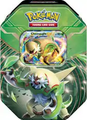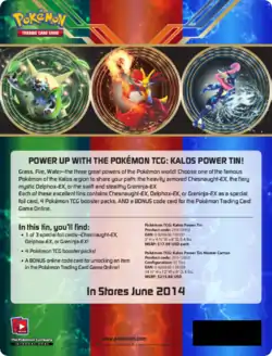 The next trio of tins to be released centered around Pokémon-EX versions of the Kalos region's final starter evolutions: Chesnaught, Delphox, and Greninja. Released June 12, 2014, the Kalos Power Tins contained an exclusive Holofoil promotional print of each Pokémon-EX, four additional booster packs (1 Flashfire, 1 XY, 1 Plasma Blast and 1 Plasma Freeze), and a code card for the online TCG game.