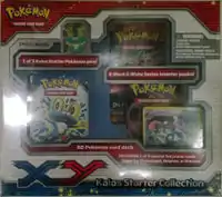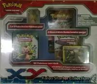 Available starting in December 2013 were the Kalos Starter Collections. These collections were yet another option available to those looking for the Kalos Starter Set. Included in each Kalos Starter Collection is the 60 card Chespin Deck, Fennekin Deck, or Froakie Deck, a card checklist for the Kalos Starter Set, a coin featuring one of the three Kalos starter Pokémon, a 2-player playmat and rulesheet, 2 Black & White Series booster packs, a code card that unlocks the respective deck online, as well as one of the three Collector's Pins available in the Collector's Pin Three Pack Blisters. However, this variation of the Kalos Starter Set merchandise only has each Stage 2 Pokémon as a Sheen Holofoil card, instead of the entire evolutionary family of the Kalos starter Pokémon.