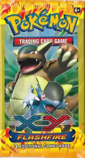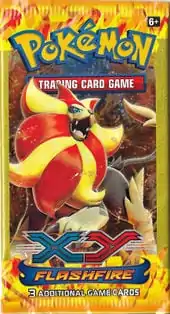The Flashfire expansion featured its own set of Blister Packs set released alongside the expansion on May 7, 2014. Four different Blister Packs were available: 2 Three Pack Blisters and 2 single Pack Checklane Blisters. The Three Pack Blisters, available in North America for the first time since Boundaries Crossed, featured the original cardboard packaging in favor over the plastic packaging first utilized halfway through the release of the Emerging Powers Blisters. As the name suggests, three Flashfire booster packs were available in each Blister, along with a coin and either a promotional Plasma Blast Haxorus or a promotional Plasma Blast Machamp. The Single Pack Blisters featured 1 Flashfire pack, 1 coin, and either a Skiddo or Honedge Cosmos Holofoil XY Black Star Promotional card. The coins in these four Blisters were primarily large-sized, Silver Cracked Ice Holofoil, Black-backed Xerneas or Yveltal Coins, though some included repackaged coins from earlier Theme Decks.