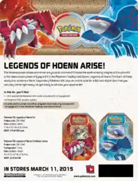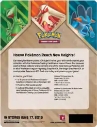 The Hoenn Power Tins, featuring three different Pokémon-EX, were made available exclusively at Wal-Mart stores starting June 1, 2015, and distributed elsewhere June 17, 2015. Containing four booster packs and a code card for the TCGO, the three tins feature Sceptile, Blaziken, and Swampert, the three final starter evolutions of the Hoenn region, as Pokémon-EX cards. At the time of release, Sceptile-EX was not revealed for release in Japan, but the two others were already made available through various XY-P Promotional means. Like the last released Legends of Hoenn Tins, the code card unlocks a full 60-card deck (the code from the Sceptile-EX tin unlocks the Sceptile-EX Deck, the code from the Blaziken-EX tin unlocks the Blaziken-EX Deck, and the code from the Swampert-EX tin unlocks the Swampert-EX Deck).