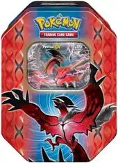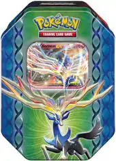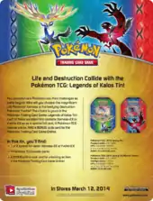 In the month following the release of the XY expansion, specifically on March 12, 2014, a pair of tins named the Legends of Kalos Tins were released. Featuring two members of the Kalos region's aura trio, the Legends of Kalos Tins include special XY Black Star Promotional reprints with new artwork of the Xerneas-EX and Yveltal-EX Pokémon-EX cards from the XY expansion. Also included in each tin were 4 booster packs as well as a code card for unlocking the promo card in the Pokémon Trading Card Game Online.