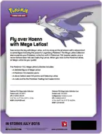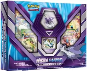 Only one month after the release of the Mega Rayquaza Collection figure box, the Mega Latios Collection made its way out to fans on July 15, 2015. The box contains a Mega Latios figure, Latios card, four booster packs, and a code card. The Latios card is a reprint of the Latios previously featured in the XY Trainer Kit: Latias & Latios.