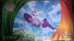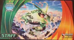 Staff for the events were presented with a Staff print of the Blaziken promotional card, staff-stamped Rayquaza playmat, staff-stamped VG playmat, as well as the two player playmats featuring Kyogre and Groudon used on the play areas of the tournament. Other unused merchandise from the main events were also presented to them for their efforts.