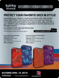 Available October 21, 2015 on the same day as the Battle Arena Decks: Mewtwo vs. Darkrai were the Ancient Origins Elite Trainer Deck Shields. The new tins come in two designs, one featuring Latios and Rayquaza, and the other featuring Hoopa in both its forms, Hoopa Confined and Hoopa Unbound. Each metal tin has room for carrying around a deck plus a storage compartment in the lid to hold dice and damage counters. The product also was packaged with 2 booster packs of Ancient Origins and a set of 5 of each basic Energy card.