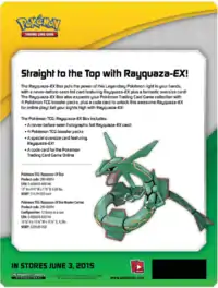 Celebrating the Sky High Pokémon Rayquaza, the Rayquaza-EX Box, released on June 3, 2015, is the next in the long series of Jumbo card promo boxes. Sporting an exclusive Rayquaza-EX promotional card different from the two included in the Roaring Skies expansion, the Rayquaza-EX Box contains four booster packs from recent expansions, a code card, and regular and Jumbo sized releases of the exclusive promotional card.