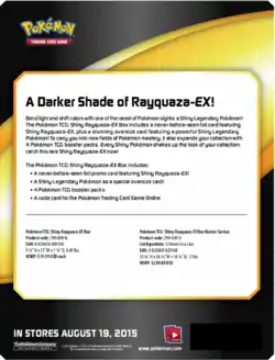 Following the Rayquaza-EX Box, the Shiny Rayquaza-EX Box released on August 19, 2015 featuring promotional and Jumbo cards. Unlike previous Boxes, the two cards are not the same: the regular card is the Shiny print of Rayquaza-EX, which was released in Japan during a mail-in campaign held around the release of Emerald Break, while the Jumbo card is one of the three Shiny Pokémon-EX from the Ancient Origins expansion, with the different cards exclusive to certain stores. It also includes 4 booster packs and a code card.