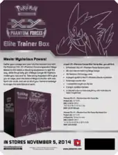 XY brings the third installment of the Elite Trainer Box. Released alongside the XY Theme Decks and Blisters, the Elite Trainer Box comes in two varieties: one featuring Xerneas and one featuring Yveltal. In addition to the same contents as the Plasma Blast Elite Trainer Box, the XY Elite Trainer Box adds Fairy Energy into the stock of basic Energy. Each Box also contains 65 themed card sleeves, 2 acrylic Special Condition markers, 6 dice as damage counters, 1 large die for coin flips, 4 dividers, the XY Player's Guide detailing the XY expansion, and a collector's box.