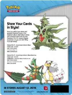 The Ancient Origins Collector's Album is a small binder able to fit 60 cards. It features Mega Sceptile, Mega Ampharos, and Mega Tyranitar on the covers, and came with 1 pack from the expansion.