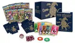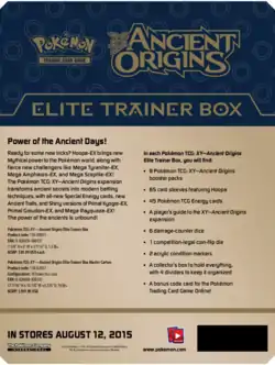 Continuing the trend of Elite Trainer Boxes, Ancient Origins brought with it the eighth installment, featuring Hoopa Unbound. Like all other Elite Trainer Boxes, it contains a stock of Energy cards, 65 card sleeves themed around the featured Pokémon, 6 damage counter dice, a coin-flip die, two acrylic Special Condition markers, a player's guide for the expansion (the Ancient Origins Player's Guide), and a collector's box.