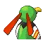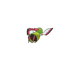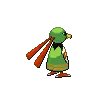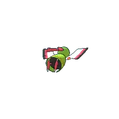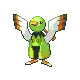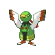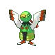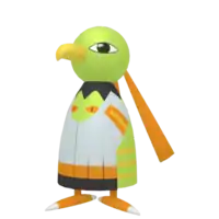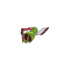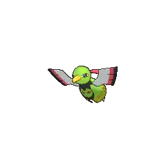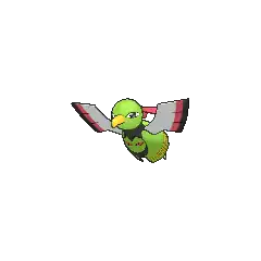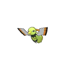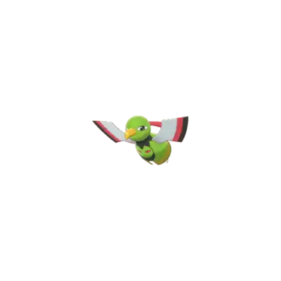 Xatu is a green, condor-like Pokémon with long, red-and-black tipped white wings that cover most of its front. Underneath its wings are designs that resemble red eyes. Along with its main green coloration, Xatu's design has accents of black, yellow, and red. There is an extra set of yellow stripes on a male Xatu. It has almond eyes, a long, slightly hooked beak, and two long, red feather crests. Xatu's feet have only two toes, one in front and one in back. Xatu's design is similar to a totem pole or a kachina doll.