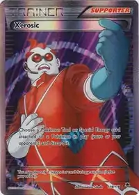 Xerosic was released as a Supporter card in the Pokémon Trading Card Game during the English XY Series (the Japanese XY Era). It was first released in the Phantom Gate expansion before debuting in English in the Phantom Forces expansion, with an illustration based on the Yusuke Ohmura artwork of the character. It was also released as a Full Art card in both expansions, with an illustration by Masakazu Fukuda. Xerosic allows the player to discard a Pokémon Tool or Special Energy card from any Pokémon.