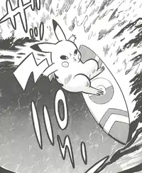 It first appeared when "Red" tried messing up the city. Later, after "Red" revealed himself to be Yellow, Pikachu had a battle with the real Red's Pikachu to see who was stronger. Since both sides were equal in strength, Yellow's Pikachu then shows off its surfing skills. It did very well until Clefairy arrived with multiple Blastoise and they made the wave huge by using their cannons, which swallowed everyone up. Pikachu reappeared in Fighting Over Otoshidama!! where it was seen participating in many of the events with Yellow. It made a cameo in A Finger Lickin' Battle! where he was with Yellow when Yellow was showing Red the cooking pans and pots. Pikachu's only known move is Surf. | ||
