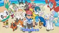 Kiawe and his Pokémon train at home, Lana and Primarina (formerly her Popplio and Brionne) look at the sea while sitting on some rocks, Mallow and Tsareena are wearing their aprons at Aina's Kitchen, Sophocles, Togedemaru, and Vikavolt (formerly his Charjabug) look at the night sky, and Lillie strokes a sleeping Snowy at her house. In a rocky location, Ash pulls his hat back and sends out Lycanroc to battle Gladion's Lycanroc. Ash's Rowlet and Hau's Dartrix fly past Hau before taking to the skies. Torracat then battles the Masked Royal's Incineroar before Pikachu battles a Zeraora.