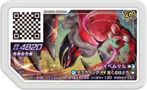Yveltal (Japanese: イベルタル Yveltal) is a Grade 5 Pokémon Ga-Olé disk. It is part of the second Grand Rush set.