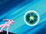 The gem on Espeon's forehead glows green and it fires a blue-green ball of electricity from it at the opponent. | ||