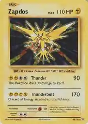 Zapdos (Japanese: サンダー Thunder) is a Lightning-type Basic Pokémon card. It is part of the Evolutions expansion.