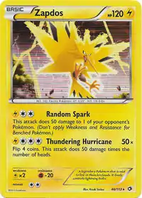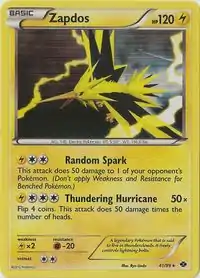 Zapdos (Japanese: サンダー Thunder) is a Lightning-type Basic Pokémon card. It was first released as part of the Next Destinies expansion.