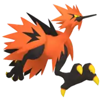 In Galar, Zapdos has a different appearance. The main body is red-orange with black plumage. Its head features yellow eyes with more pronounced, mask-like black coloration around them, a shorter black beak, and a longer, more visible neck. Its legs are black, longer, and more muscular, its thigh feathers are also black, and its talons are yellow with red rings at their bases. Its red-orange wings are smaller, with small black markings that appear to be remnants of its Kantonian counterpart's black plumage. Finally, it has a row of spiky feathers along its chest, and a similar row of black feathers on its back.