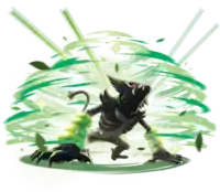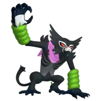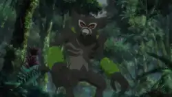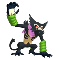 Zarude can extend prehensile vines from its wrists, neck, and the soles of its feet at will. It uses these vines to attack, swing from trees, and collect food from a distance. Zarude’s vines can also rapidly heal wounds when wrapped around them and absorb energy from trees. While resting, only the tips of the vines at Zarude's neck and feet extend beyond its skin. However, the vines extending from Zarude's wrists are typically wrapped around its forearms in four concentric rings. Occasionally, Zarude's vines tear off and become nutrients for the soil of the forests it lives in. The Zarude follow a sacred law that allows no outsiders to be a part of their pack and protect the scared springs of the Great Tree.