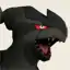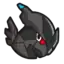 Zekrom is a black, bipedal Pokémon resembling a dragon or dinosaur, with dark patches on various portions of its body. It has red sclerae, white irises, and black pupils, as well as a small horn-like protrusion on the tip of its snout. Its head sports a thundercloud-like crest tipped with light-blue coloration. There are six pairs of pointed teeth visible when its mouth is open, two in the upper jaw and four in the lower. At the base of its neck is a black, stud-like feature, and atop its shoulders are similar, larger features resembling armor padding. The bases of its wings also have such padding, and a fanned, splayed, seemingly webbed shape with a small "wing-spike" on one edge. The lower lengths of Zekrom's arms extenuate into splayed, seemingly webbed, somewhat baseball-mitt-like formations, with three-clawed, dark-colored hands on the undersides. The front portion of Zekrom's waist is black-colored, with its belly and thighs having thin striations down their length. Its knees are black, as are the foremost parts of its three-clawed feet and spiked heels. When its emotions surge, it enters Overdrive mode and its tail lights up with a blue light.
