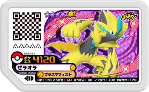 Zeraora (Japanese: ゼラオラ Zeraora) is a Grade 4 Pokémon Ga-Olé disk. It is part of the fifth Grand Rush set.