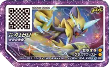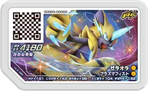 Zeraora (Japanese: ゼラオラ Zeraora) is a Grade 5 Pokémon Ga-Olé disk. It is part of the third Ultra Legend set.