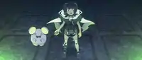 Later, Zinnia arrives at Sea Mauville with several Team Aqua and Team Magma Grunts. She finds Mr. Stone using the Absorber to drain the life energy of Sapphire's Chic and Emerald's Sceptile in their Mega-Evolved states to power a machine that will be able to warp the meteoroid away. She reveals that she had spied on Team Magma and Team Aqua during their attempts to awaken Groudon and Kyogre and made allies with several of the Grunts of both teams. She and the Grunts attack everyone to steal the dimensional shifter that Mr. Stone was powering with Chic and Sceptile's life energy. Sapphire takes the dimensional shifter and attempts to run away, but Zinnia manages to take her Mega Bracelet with the Key Stone still inside. Zinnia then decides to go after Steven's Key Stone next and begins attacking him. Just as Zinnia gets the advantage in battle, Ruby arrives with his Mega Swampert Mumu and asks everyone to stop fighting.