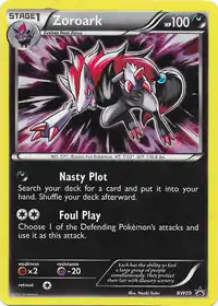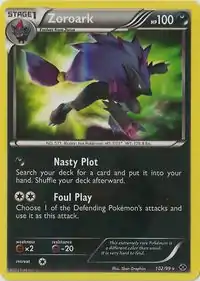 Nasty Plot and Foul Play are both moves in the Pokémon games that Zoroark can learn. This card's Black & White, BW Promotional and Extra Regulation Box Pokédex entry comes from Pokémon White. The Next Destinies print features the Shiny version of Zoroark.