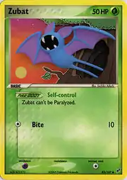 Zubat (Japanese: ズバット Zubat) is a Grass-type Basic Pokémon card. It is part of the EX Deoxys expansion.