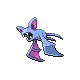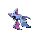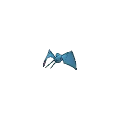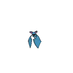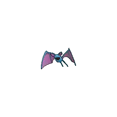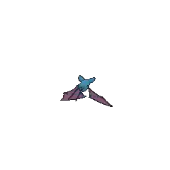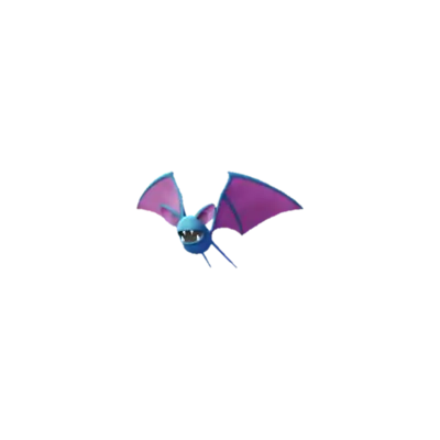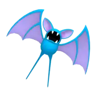 Zubat is a blue, bat-like Pokémon. While it lacks eyes, it has pointed ears with purple insides and a mouth with two sharp teeth on each jaw. A male will have larger fangs than a female. It has purple wing membranes supported by two, elongated fingers, and two long, thin, tails.